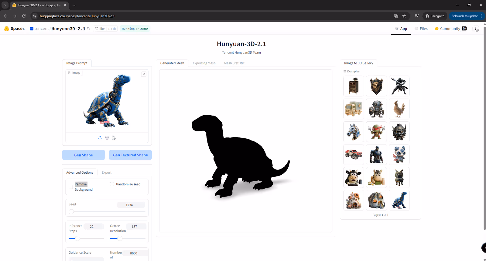 Hunyuan lets you generate a plain 3D shape or a textured version of your reference image. Shapes render in roughly 20 seconds, and textured models typically take under 60 seconds, depending on how detailed they are.
