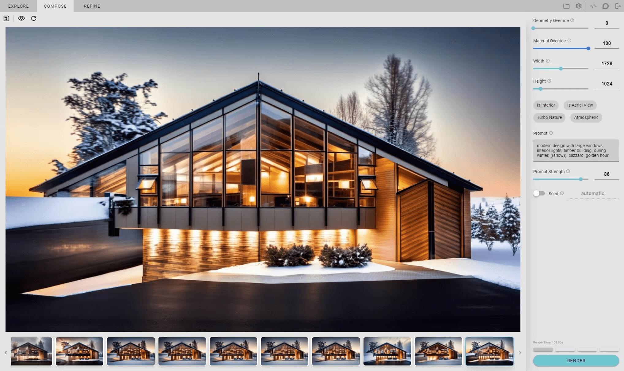 Veras lets you create both precise renders and loose, creative concepts thanks to its many creative controls, including custom prompts, geometry and material override, render selection, and rendering from the same seed.