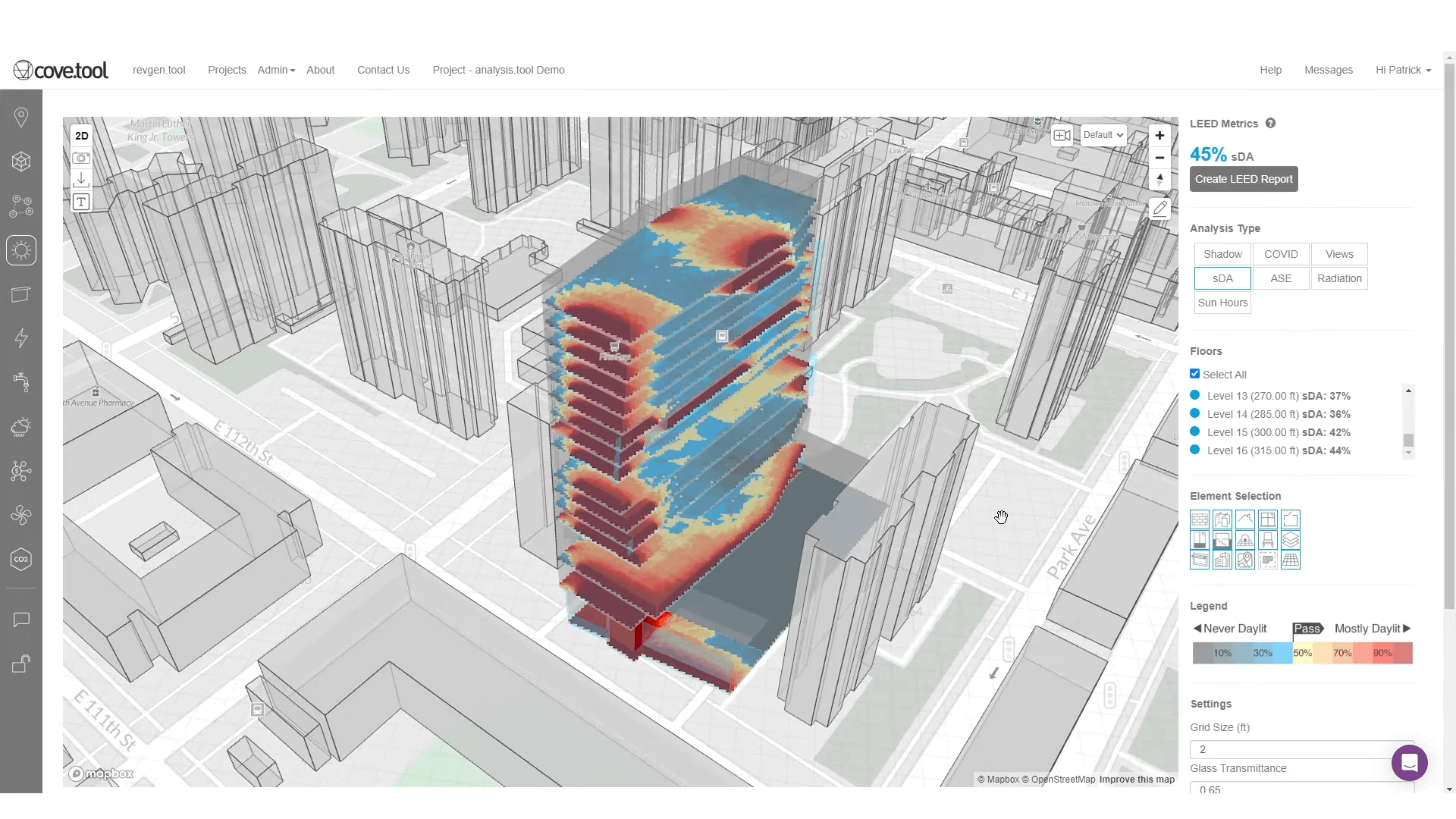 Cove is an AI performance analysis tool whose design workflows include energy modelling, daylight & glare analysis, embodied carbon assessment, cost optimization, and building compliance.