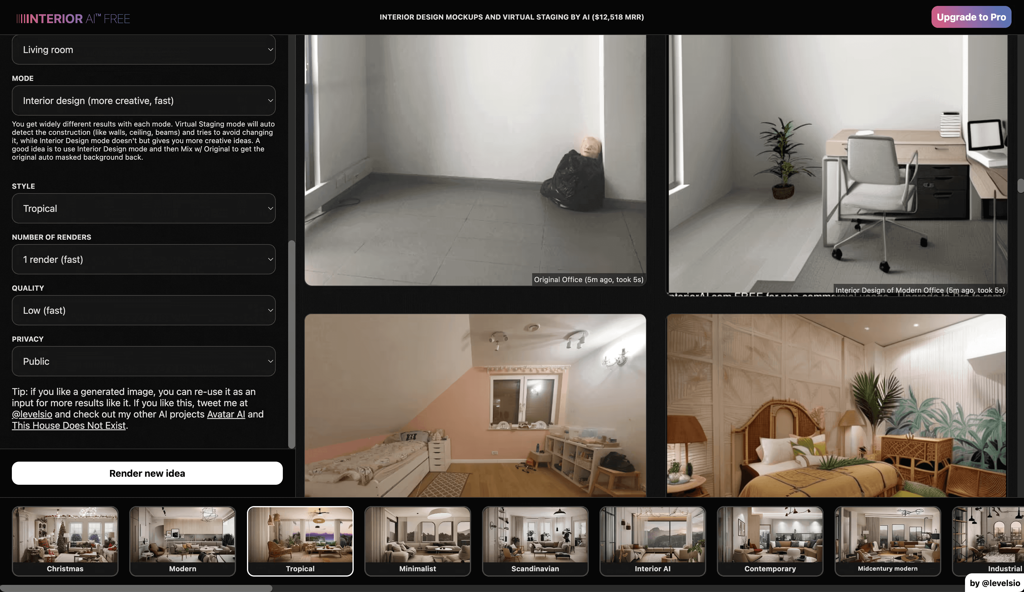 InteriorAI is an easy-to-use web app for restyling, decluttering, and furnishing interior spaces.