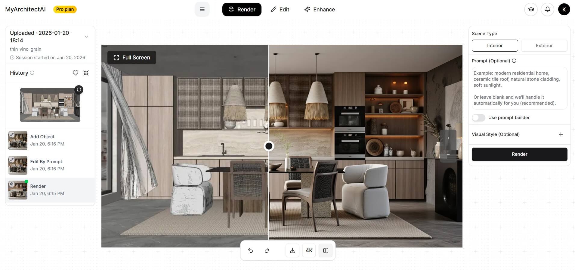 MyArchitectAI is an AI rendering tool loved by architects and interior designers for its speed, ease of use, and visual finesse.