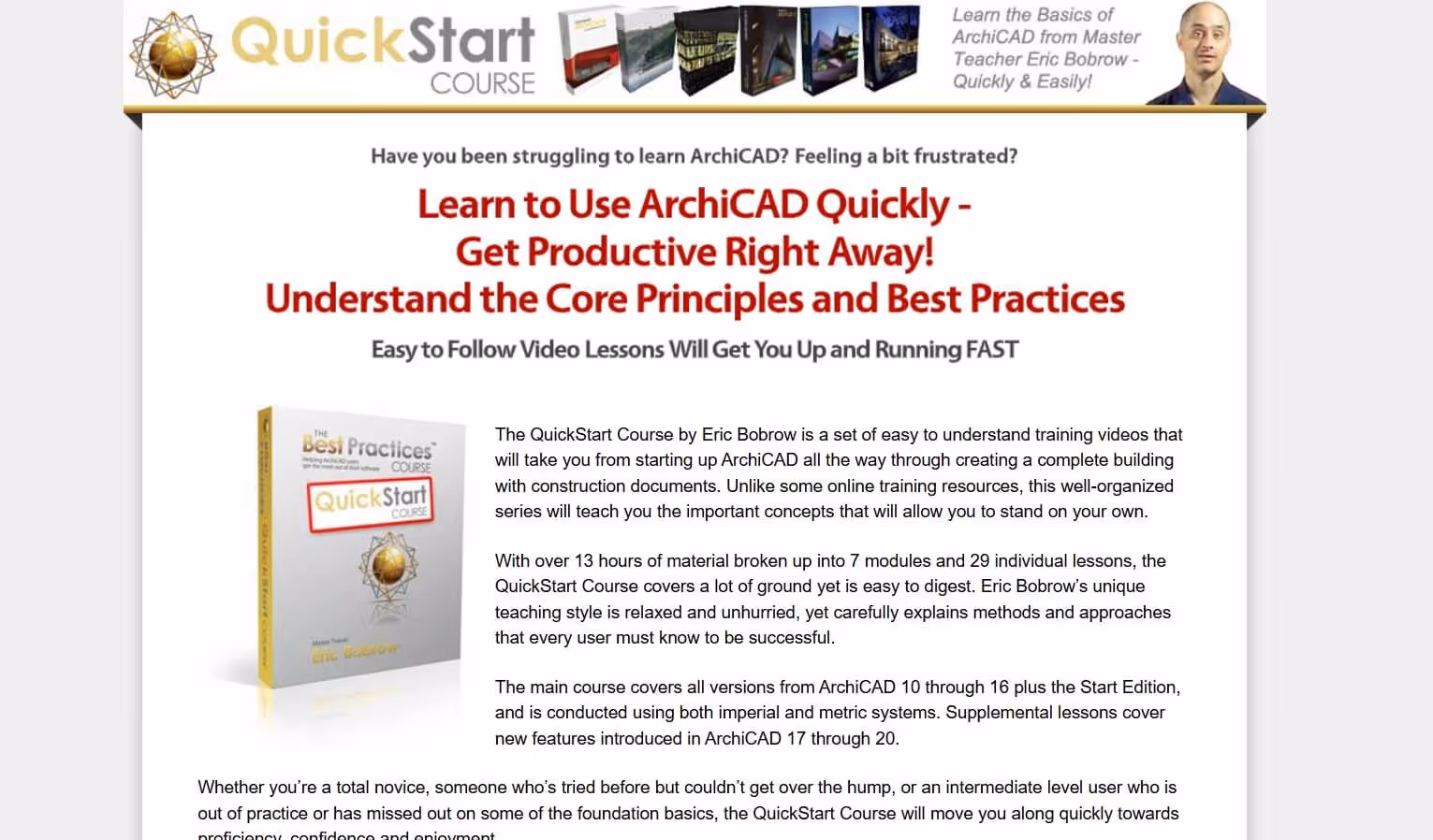 Also from Eric Bobrow, the QuickStart Course is designed specifically for Archicad tutorials for beginners who need to get productive fast. Many users report going through the entire program in a weekend and being able to contribute on projects the following week.