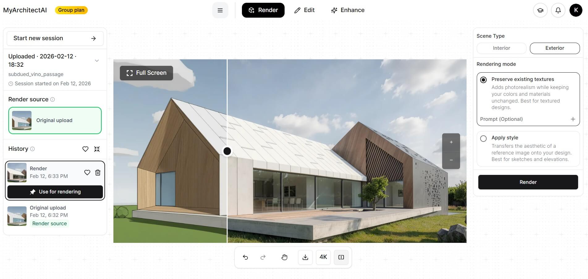 The tool runs entirely in your browser, which means it works on any device, including Macs and older laptops. The AI engine handles texturing, lighting, and atmosphere automatically, so you don't need any visualization experience to get professional-looking results.