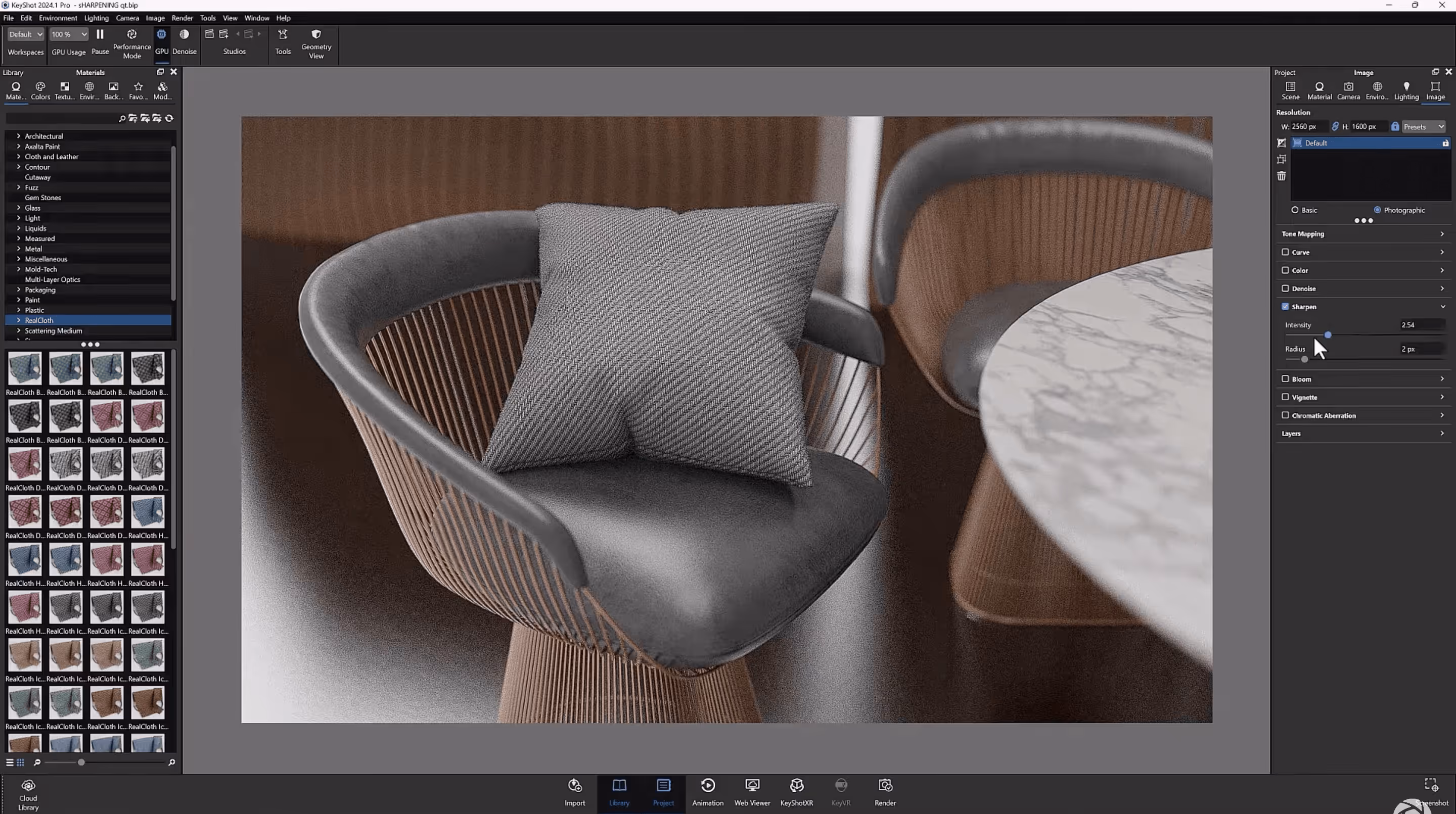 The cloud library includes thousands of scientifically accurate materials (including Pantone and RAL color libraries), and the real-time rendering preview lets you fine-tune your scene as you work. GPU rendering on Windows delivers clean 2K stills in a couple of minutes.