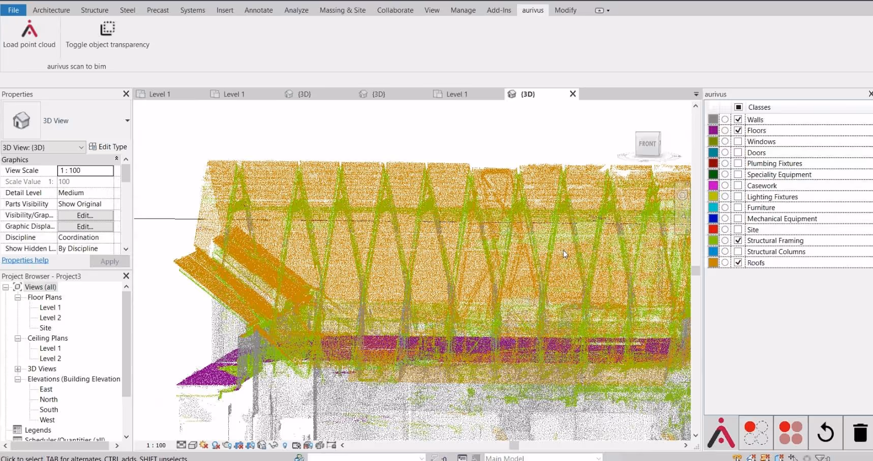 Scan-to-BIM AI learning algorithms can automatically identify architectural elements, see patterns in the point density and orientation, find gaps, and correctly identify shapes. Certain tools, such as Aurivus, take this further by adding specialized detection for MEP systems.