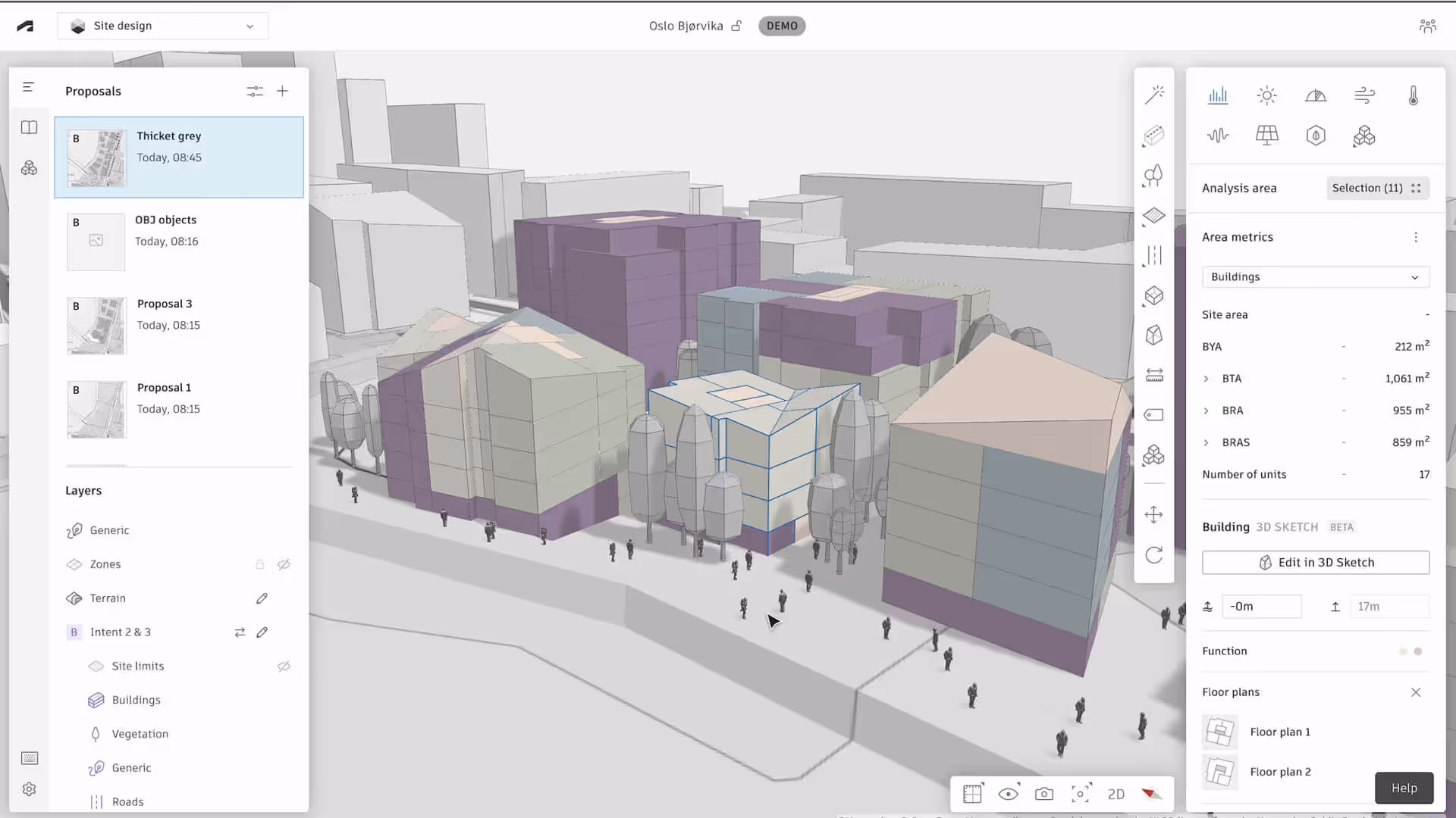 Autodesk Forma (the platform that absorbed Spacemaker) operates at the city scale. While TestFit focuses on individual parcels, Forma analyzes entire neighborhoods. The AI-powered BIM platform runs hundreds of environmental simulations, tracks shadows throughout the year, predicts noise levels from nearby roads, and suggests optimal building orientations and heights based on all related factors combined.
