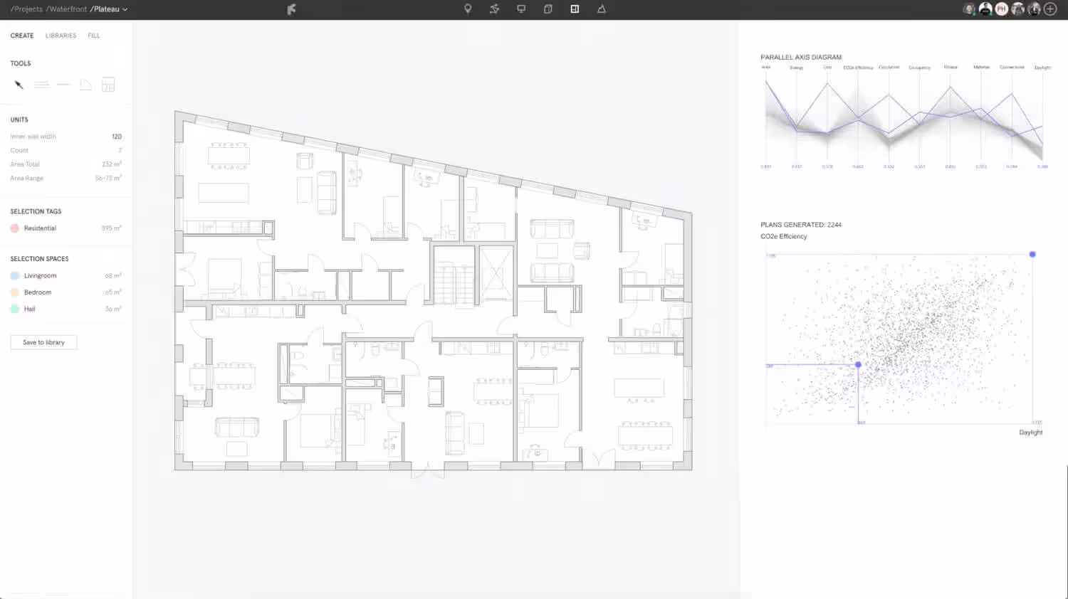 This tool combines AI-driven form generation with deep environmental analysis. The platform simultaneously optimizes for solar gain, wind comfort, views, and construction cost. Every design iteration includes detailed performance metrics.