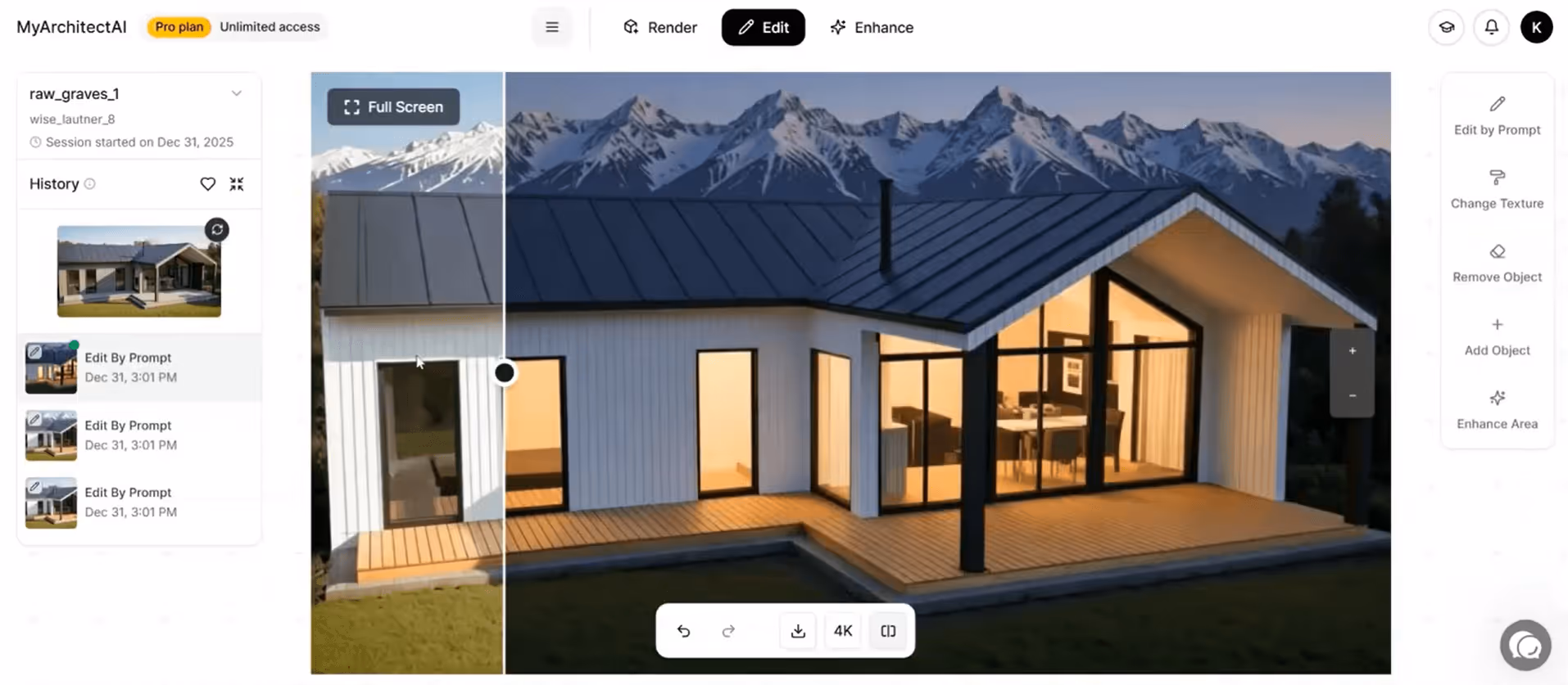 A typical client presentation that would take 8 hours with traditional rendering (model prep, material assignment, lighting setup, test renders, final output) takes under 10 minutes with MyArchitectAI. Upload your model, generate 5-10 variations, test different finishes, add entourage, and you're done.