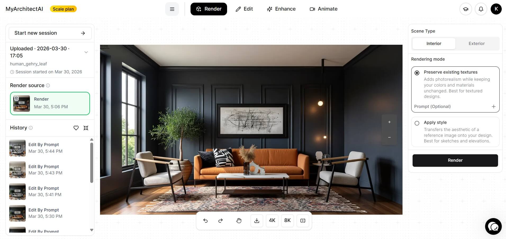 MyArchitectAI takes a fundamentally different approach. Instead of assisting your manual workflow, it handles the entire rendering process for you. Upload a design from SketchUp, Revit, Archicad, or any other tool, and its AI engine produces a photorealistic render in under 10 seconds.