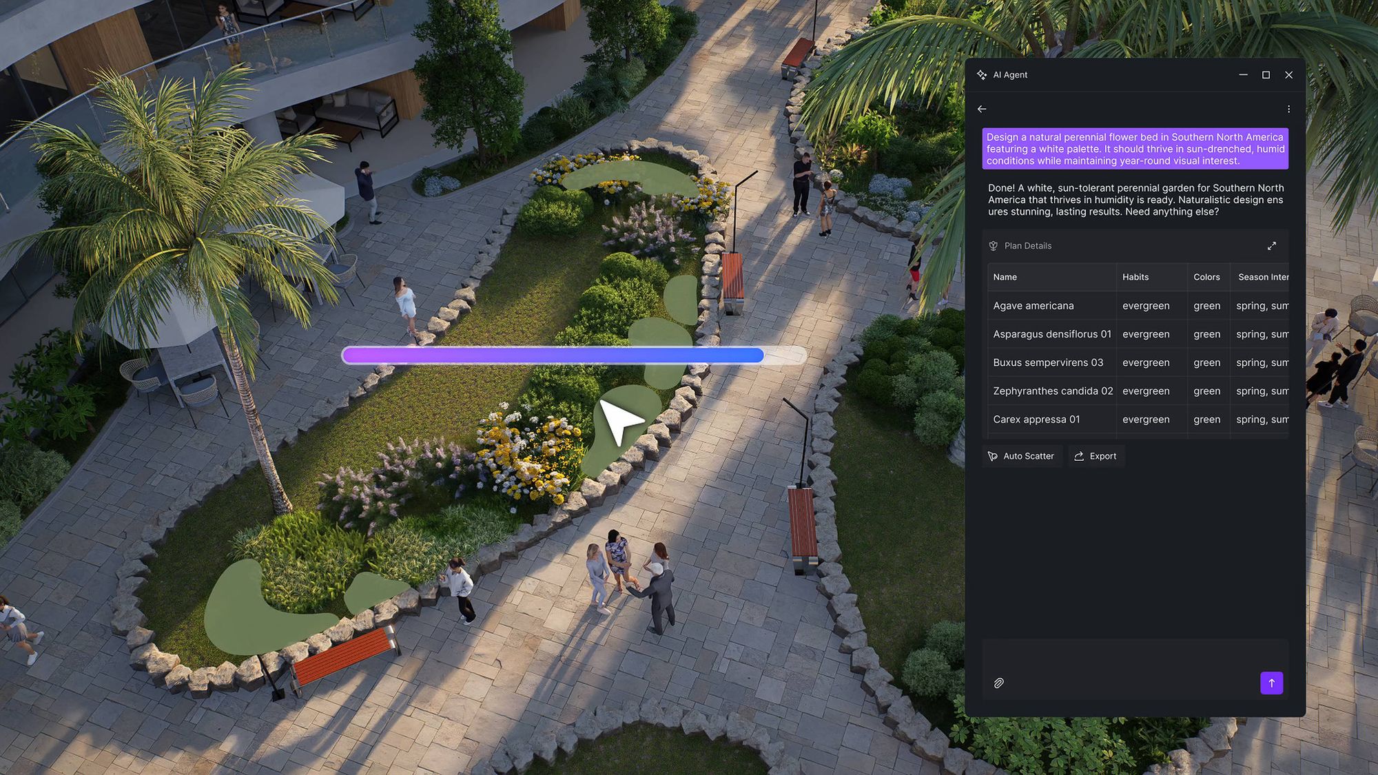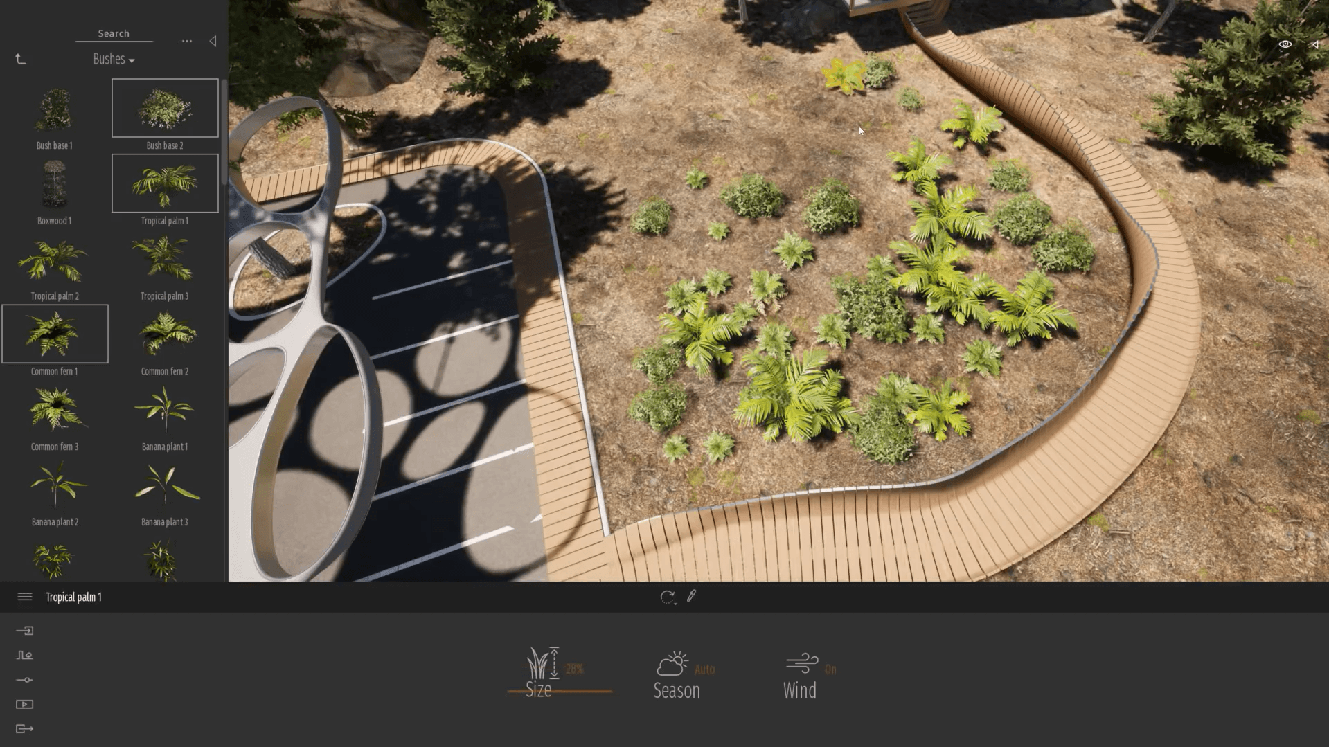 Twinmotion's Paint Vegetation and Path tools also make it quick to fill outdoor scenes with trees or animated people. In addition to those, you can change seasons, adjust the time of day, and add wind, rain, or snow.