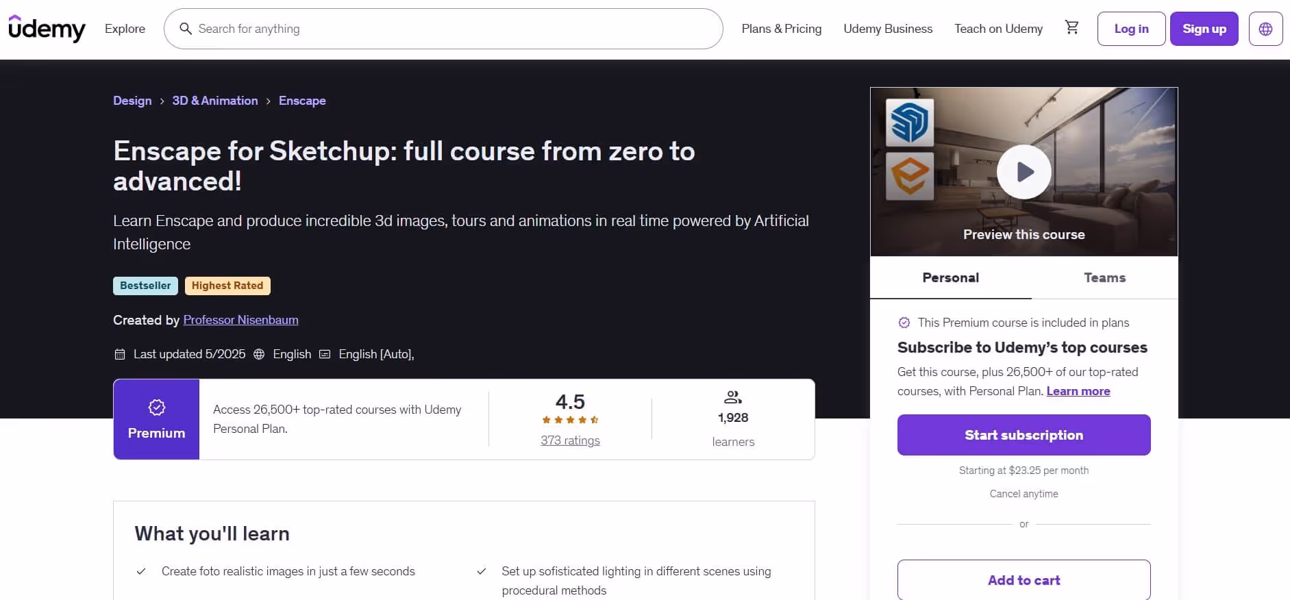 If you use SketchUp for interior design: Kate Vera's course or Professor Nisenbaum's Udemy course are tailored for this workflow. Kate's focuses specifically on interior designers; Nisenbaum's covers broader archviz applications. For more interior-specific courses, see our other guide.