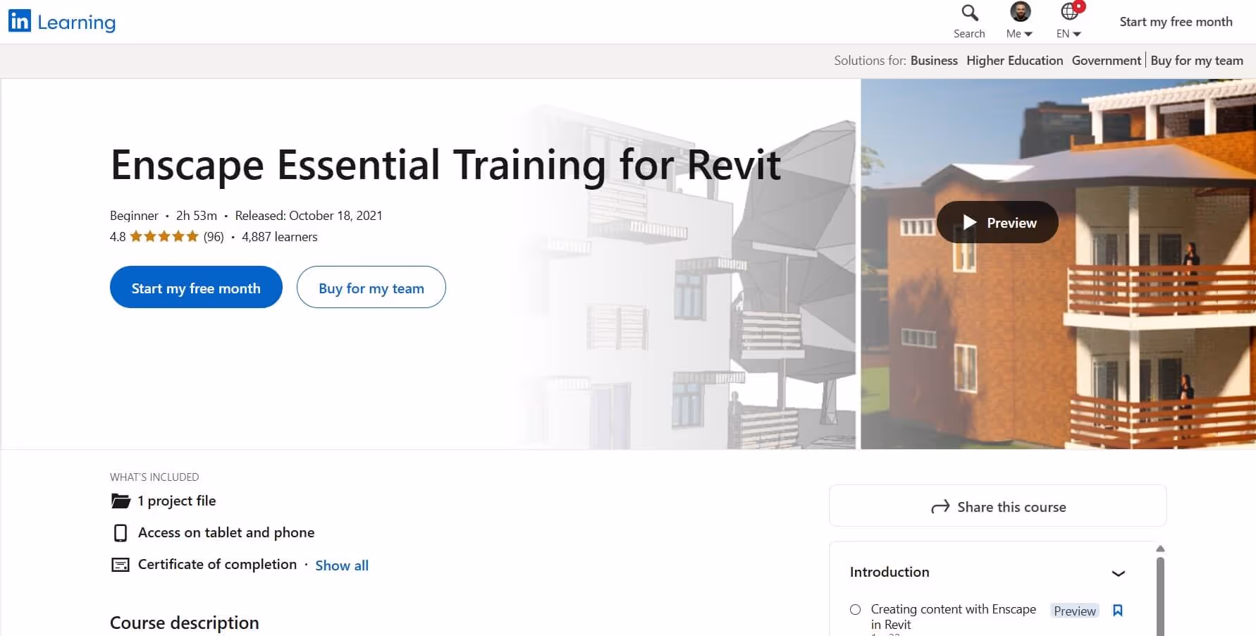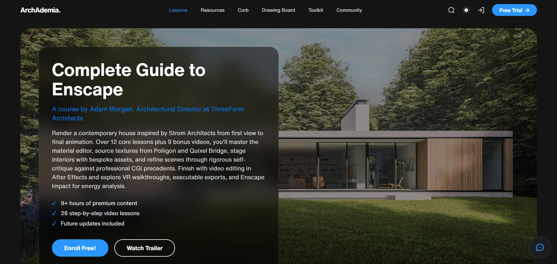 Your ArchAdemia subscription includes not just the Enscape course but their entire library of 60+ courses covering Revit, SketchUp, AutoCAD, and more. Good value if you want to level up across multiple tools, making it one of the more flexible Enscape courses on this list.