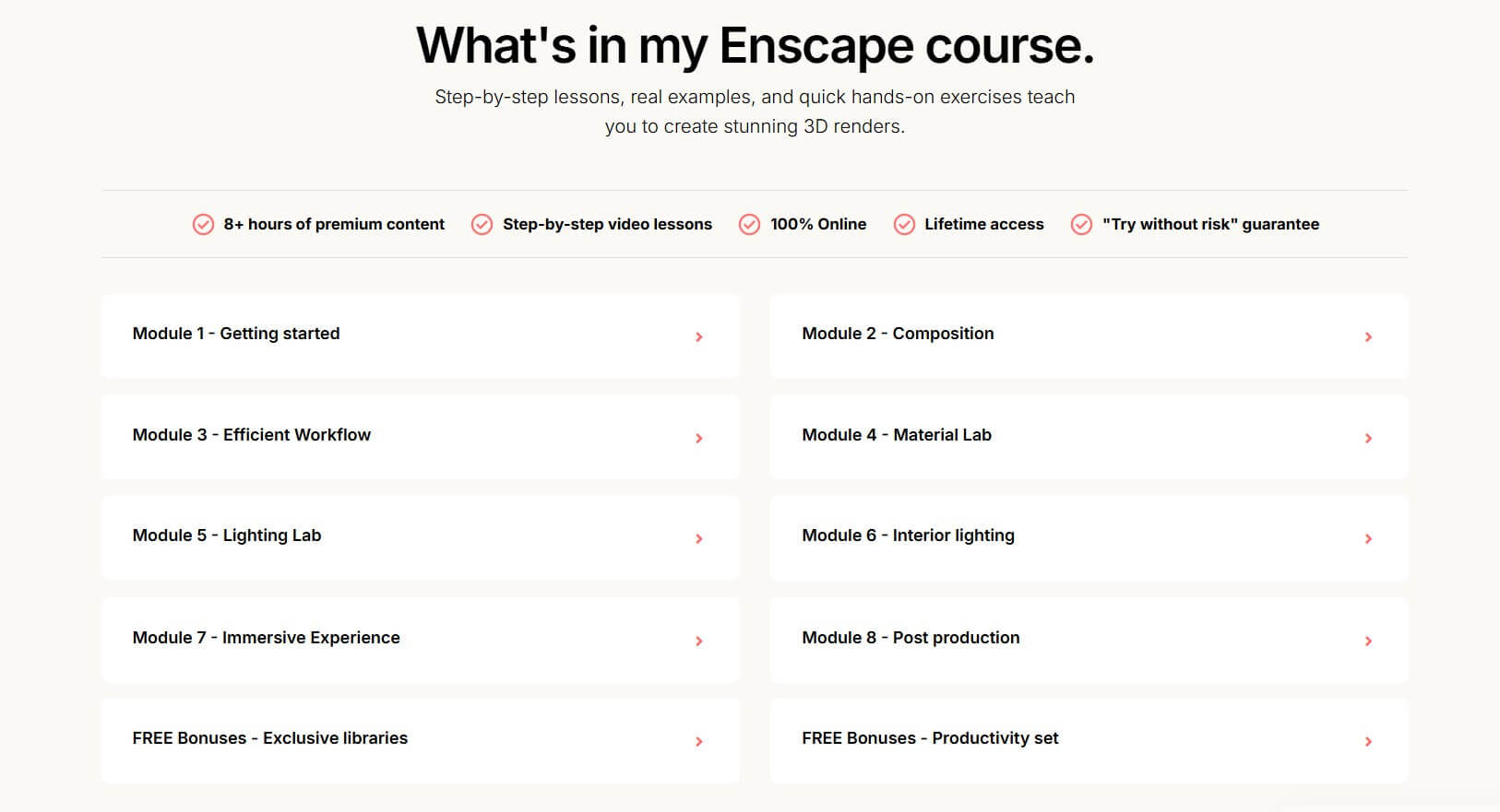 The curriculum covers the full SketchUp-to-Enscape pipeline