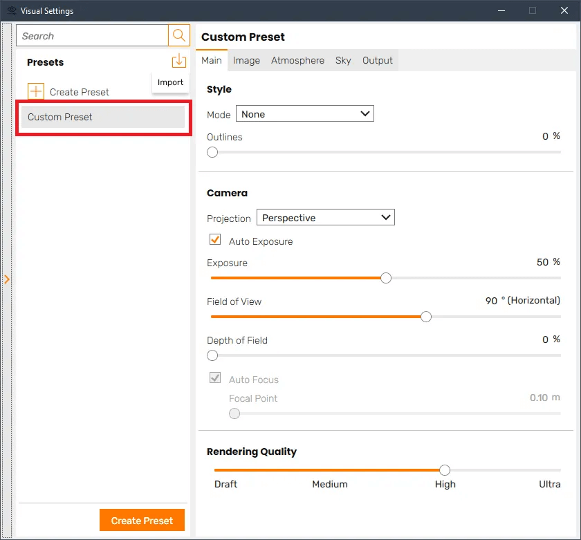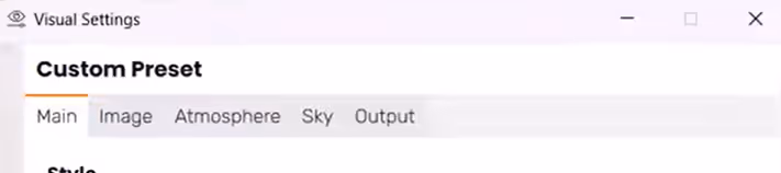 Open Enscape, then click the Visual Settings button in the viewport toolbar. This window is organized into tabs: Main, Image, Atmosphere, Sky, and Output.