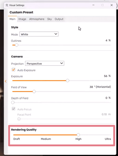 The Main tab is where you'll spend most of your time when learning how to make a realistic render in Enscape. It contains controls for rendering style, exposure, field of view, depth of field, and the all-important rendering quality slider.