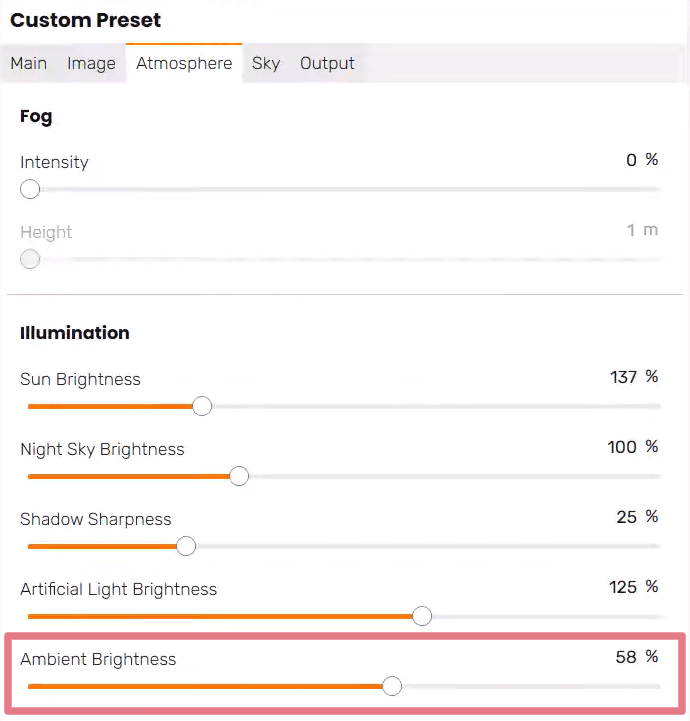 In the Atmosphere tab, you'll find the Sun Brightness slider. For most exterior scenes, keeping this at 100% works fine. But for interiors where you want sunlight streaming through windows without blowing out highlights, try reducing it to 60-80%.