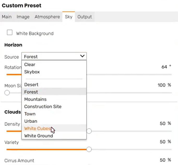 Procedural sky works well for general exterior shots. Adjust cloud density and variety to control how much direct sunlight gets through. You can also adjust cloud height and movement speed for animated scenes.