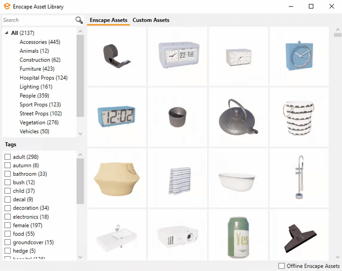 This gap in asset count is not a major limitation for Enscape users. Since version 2.9, Enscape has supported a Custom Asset Library, allowing users to import their own 3D models and reduce reliance on built-in assets.