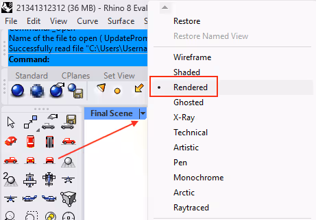 1. Go to rendered view. This switches to Rhino’s real-time rendering mode. It allows you to see how your model will look with your preferred materials and textures when rendered.