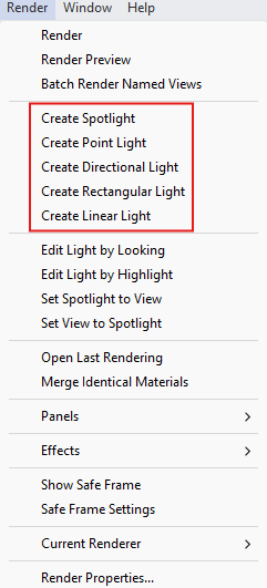 3. Set up lighting. Depending on your architectural model, you can add extra lights, on top of the Sun or Skylight lighting, to make your scene more dynamic. Under the “Render” menu, you can choose between the Spotlight, Point Light, Directional Light, Rectangular Light, or Linear Light.