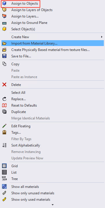 To assign this material to an object in your scene, right-click on the material swatch, then click “Assign to Object.” Finally, select an object in your scene to apply the material.