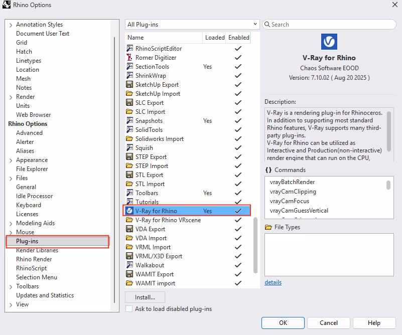 3. Activate V-Ray in Rhino. Open Rhino, go to the Plugins menu by entering “PlugInsManager” in the command bar, then select V-Ray to activate it.
