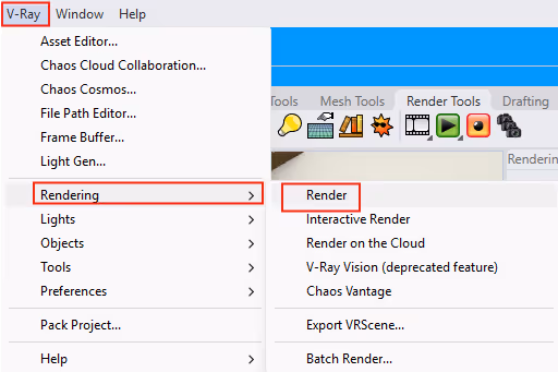 2. Go to Render Menu > Render, or simply type “Render” in the command bar. You can also go to V-Ray > Rendering > Render.