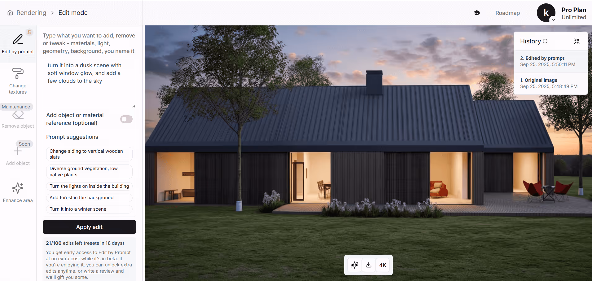 Need any adjustments? Just go to the AI editing mode and make any change you want just by describing it with words, e.g., "turn it into a dusk scene with soft window glow, and add a few clouds to the sky."