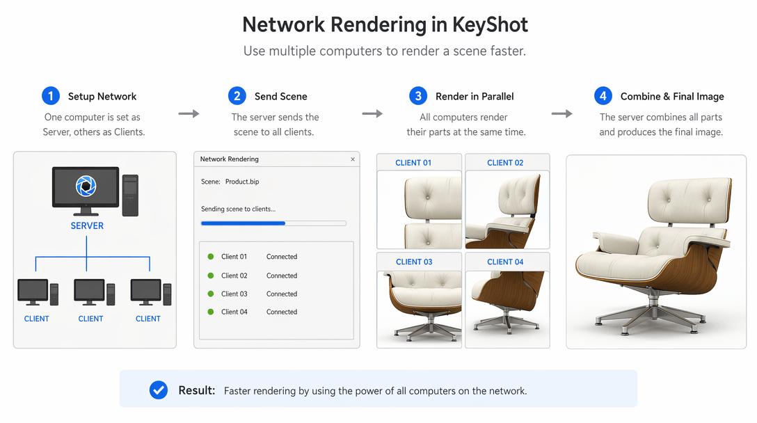 If your studio has multiple machines, KeyShot supports network rendering through KeyShot Network Rendering. It pools CPU cores across workstations on the same network, so a job that takes 30 minutes on one 16-core machine can finish in roughly 15 minutes across two.
