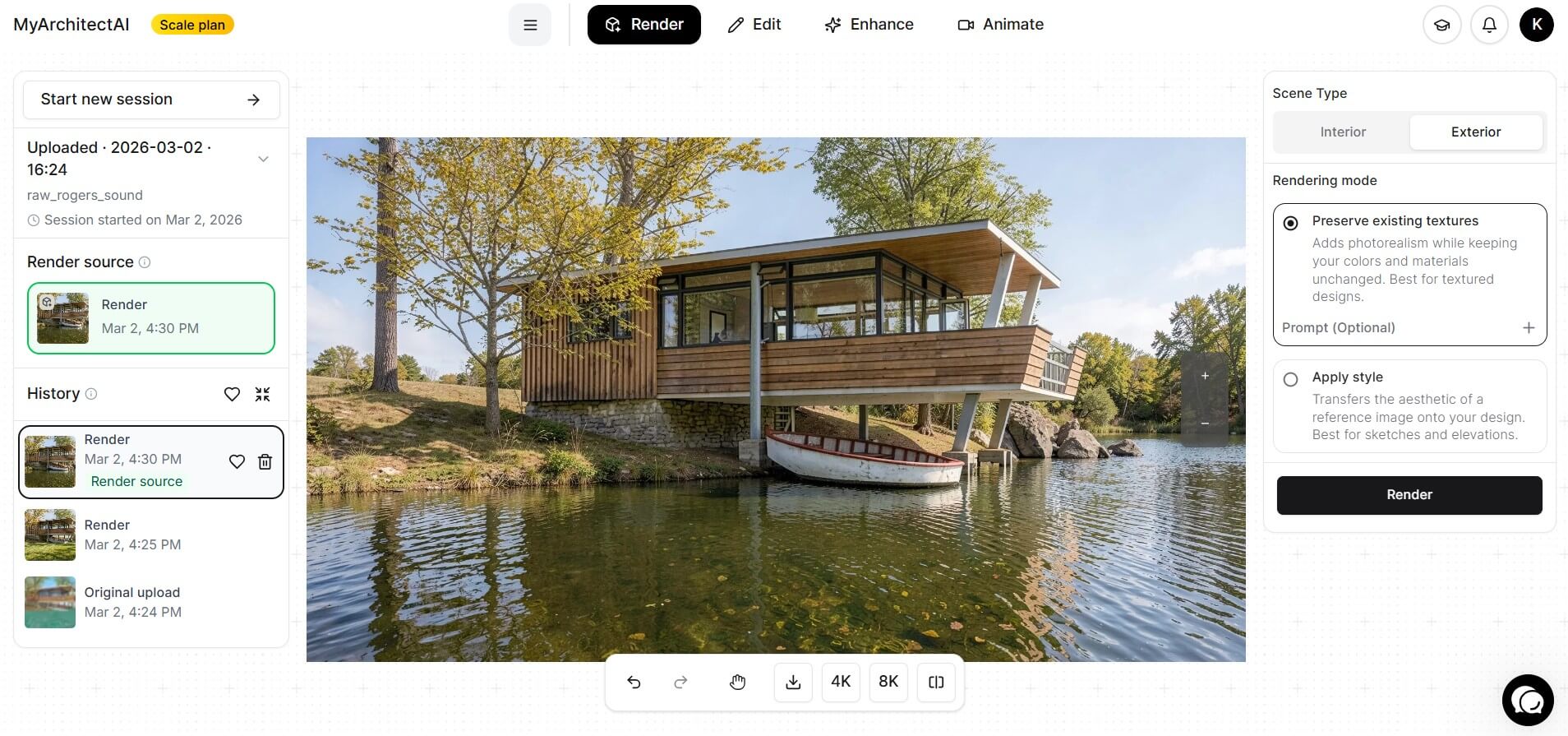 At $29/month for unlimited renders, it's also significantly more affordable at scale compared to Magnific AI pricing, where even the entry plan caps you at around 200 upscales. On top of that, MyArchitectAI gives you access to a whole suite of archviz tools that also includes an enhancer, AI image editing tools, and one-click animations. API is also available.