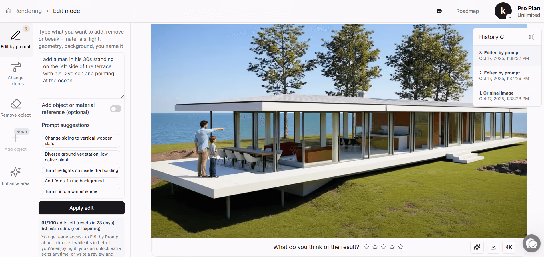 Instead of jumping back into SketchUp, Revit, or Photoshop, you can now make instant changes to your renderings just by describing the edits with words.