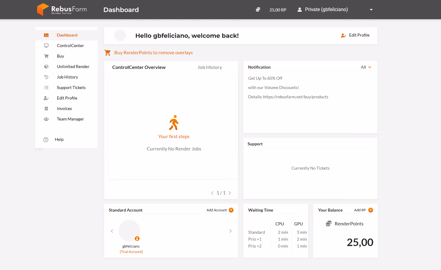 Rebus Farm follows a straightforward pricing model using a currency called Render Points (RP), with 1 RenderPoint costing $1.18. It also offers automatic volume discounts when purchasing Render Points. The more Render Points you buy, the higher the discount you receive—up to 60% off.