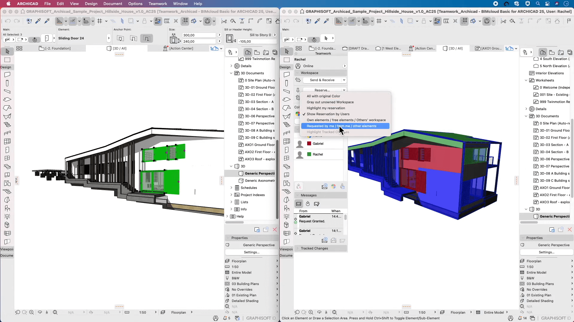 Archicad's collaboration centers on Teamwork, powered by BIMcloud. Team members reserve elements (rather than entire worksets), make changes, and send updates to the server. The delta-server technology sends only changed data, making it faster on limited connections.