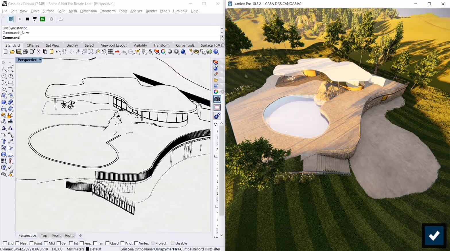 Lumion, released in 2010, makes the visualization process in the design phase instant without needing a complex setup. As you model in Rhino, you’ll see a rendered view real-time with Lumion’s LiveSync for Rhino plugin on an adjacent window to your Rhino workspace with a synced camera perspective.