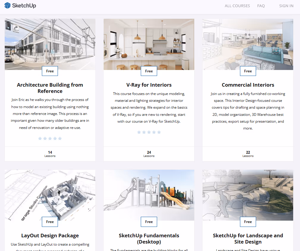 SketchUp's official learning platform offers specialized courses, including V-Ray for SketchUp tutorials, Interior Design fundamentals, and Landscape/Site Design. These free SketchUp tutorials cover everything from fundamentals to some advanced rendering techniques.