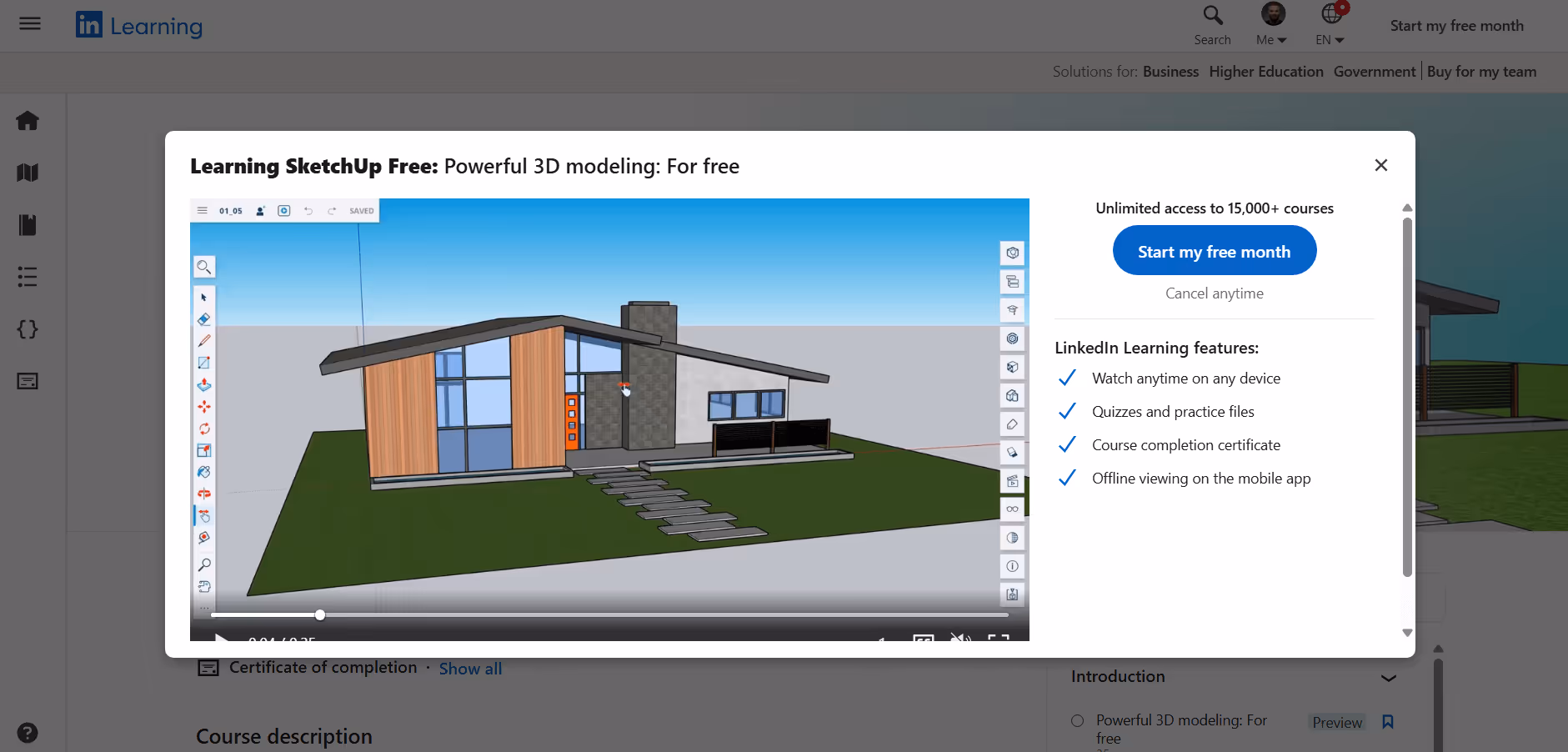 The platform offers multiple SketchUp courses, including "SketchUp Pro: Tools and Techniques" for advanced features, and specialized courses on tips and tricks. LinkedIn Learning's advantage is its integration with professional networking – you can display completed courses directly on your LinkedIn profile.