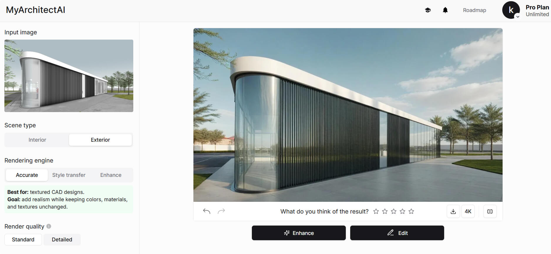 Pricing: The free plan gets you 10 renders a month. Then, you can upgrade to a flexible monthly plan for $29/month, which lets you create unlimited renderings.