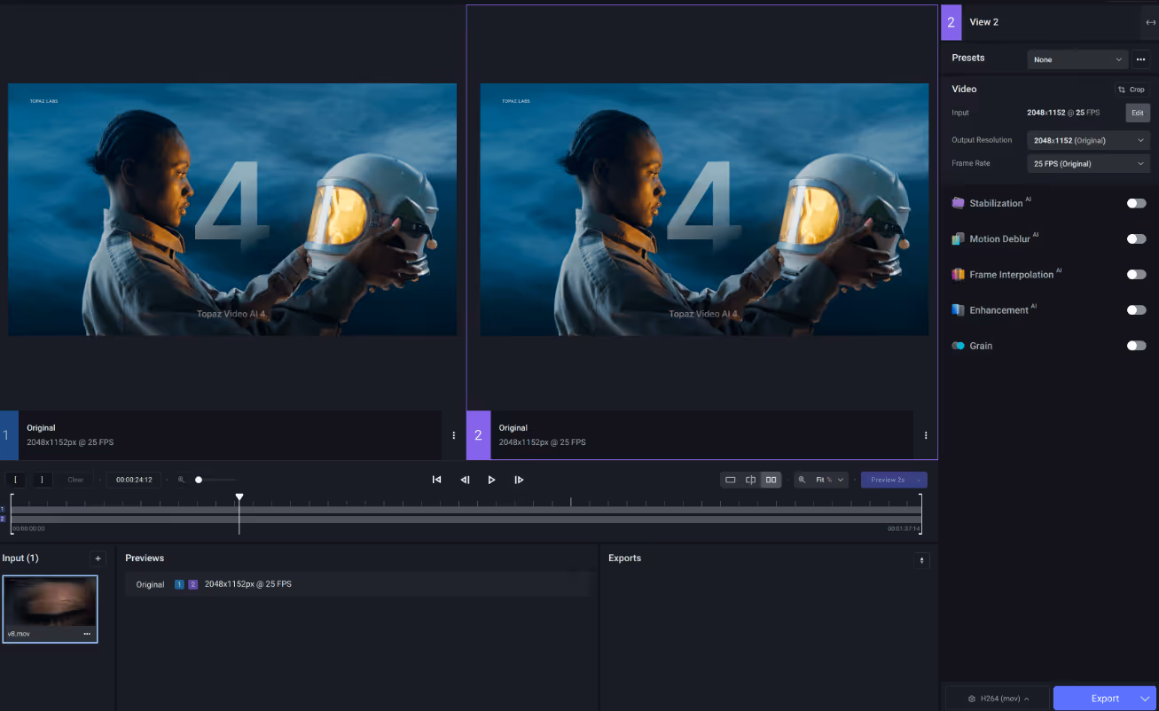 Astra does for videos what Bloom does for images, except with two modes. It gives you the option to do precise upscaling where it preserves all the elements of the original video, but sharper and larger. And, it gives you the option to do creative upscaling, where it upscales your videos to 4k with enhanced quality and finer details. It uses the same frame interpolation feature as Topaz Video.
