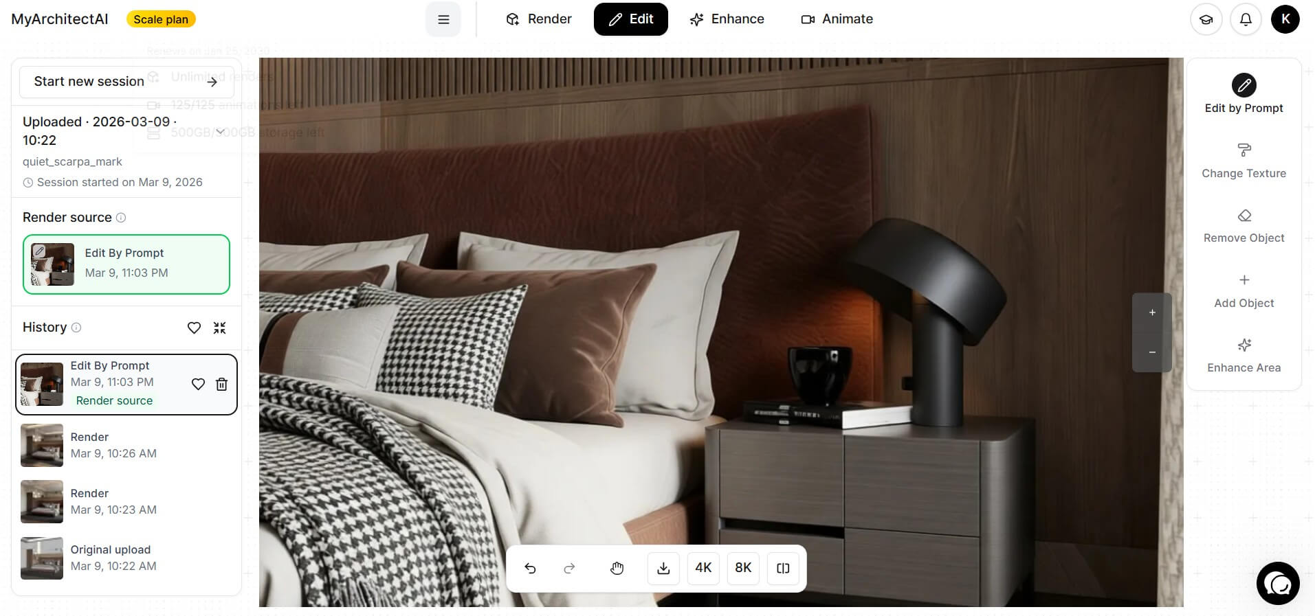 Because MyArchitectAI is AI-powered, it automatically handles render setup without requiring manual configuration. Lighting, shadows, textures, and overall visual enhancement are generated by the system, and you can further refine the output using simple text prompts.