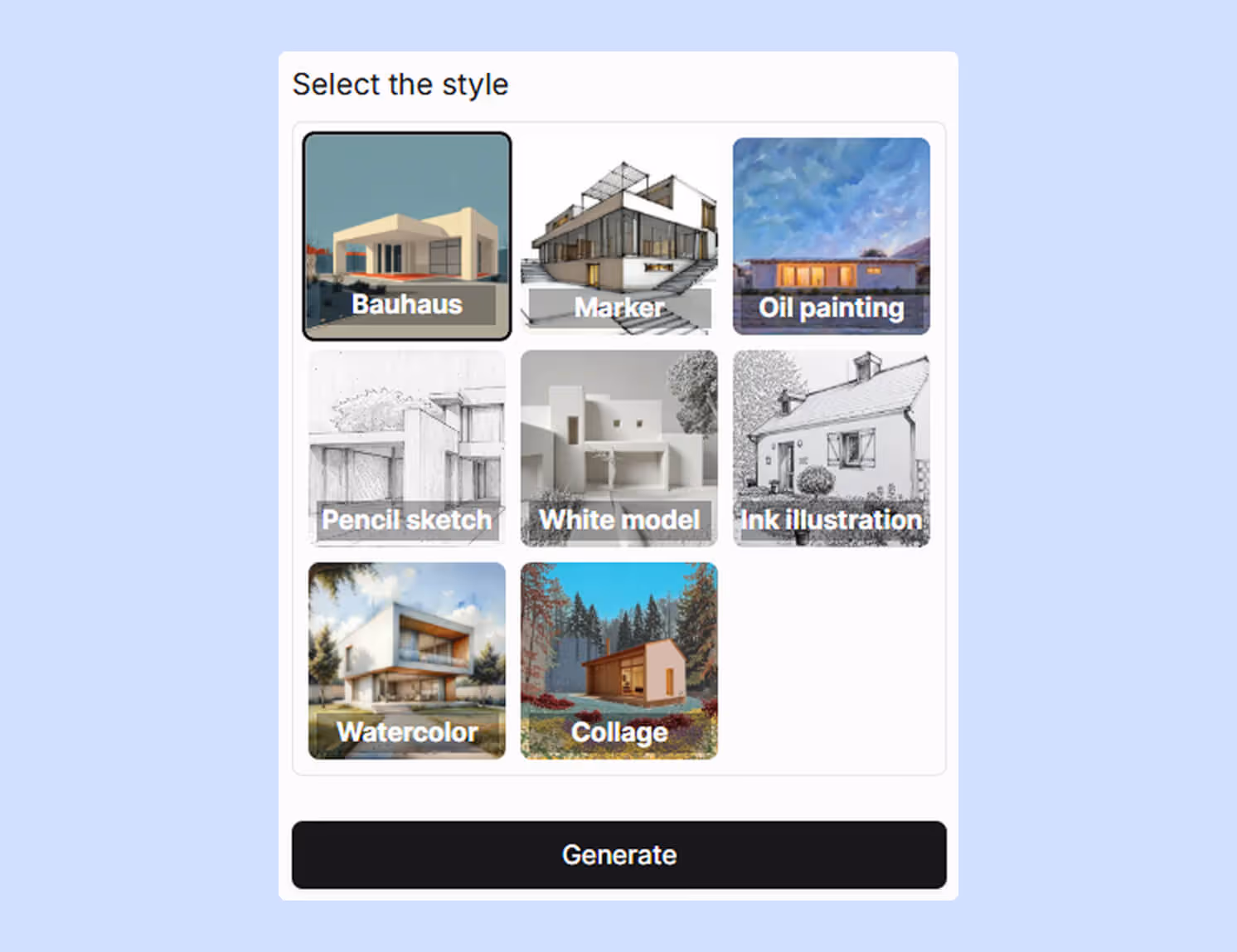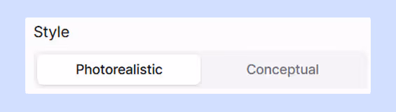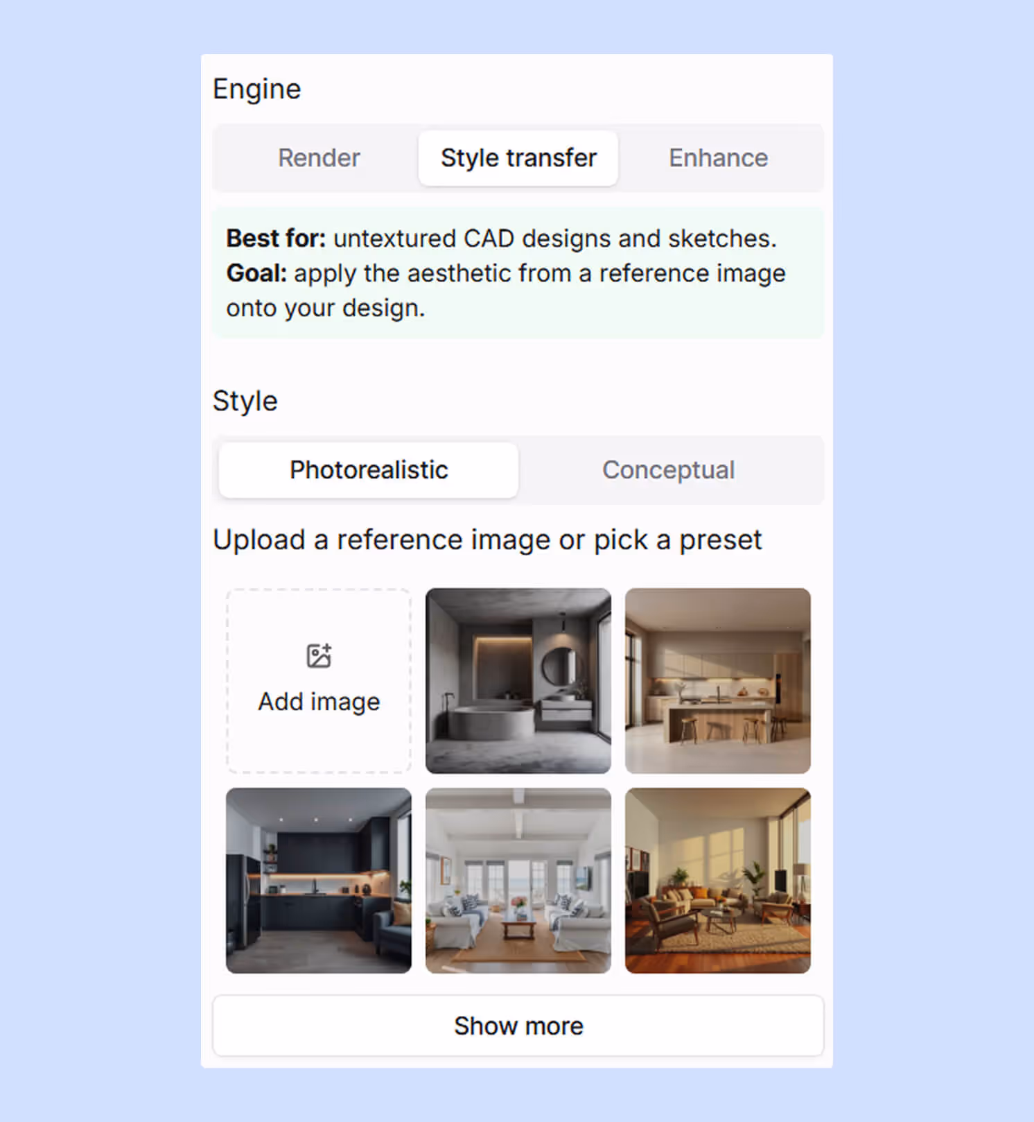 This engine is best suited for the early ideation stage of the project, and lets you create different style variations based on your reference image or style preset.