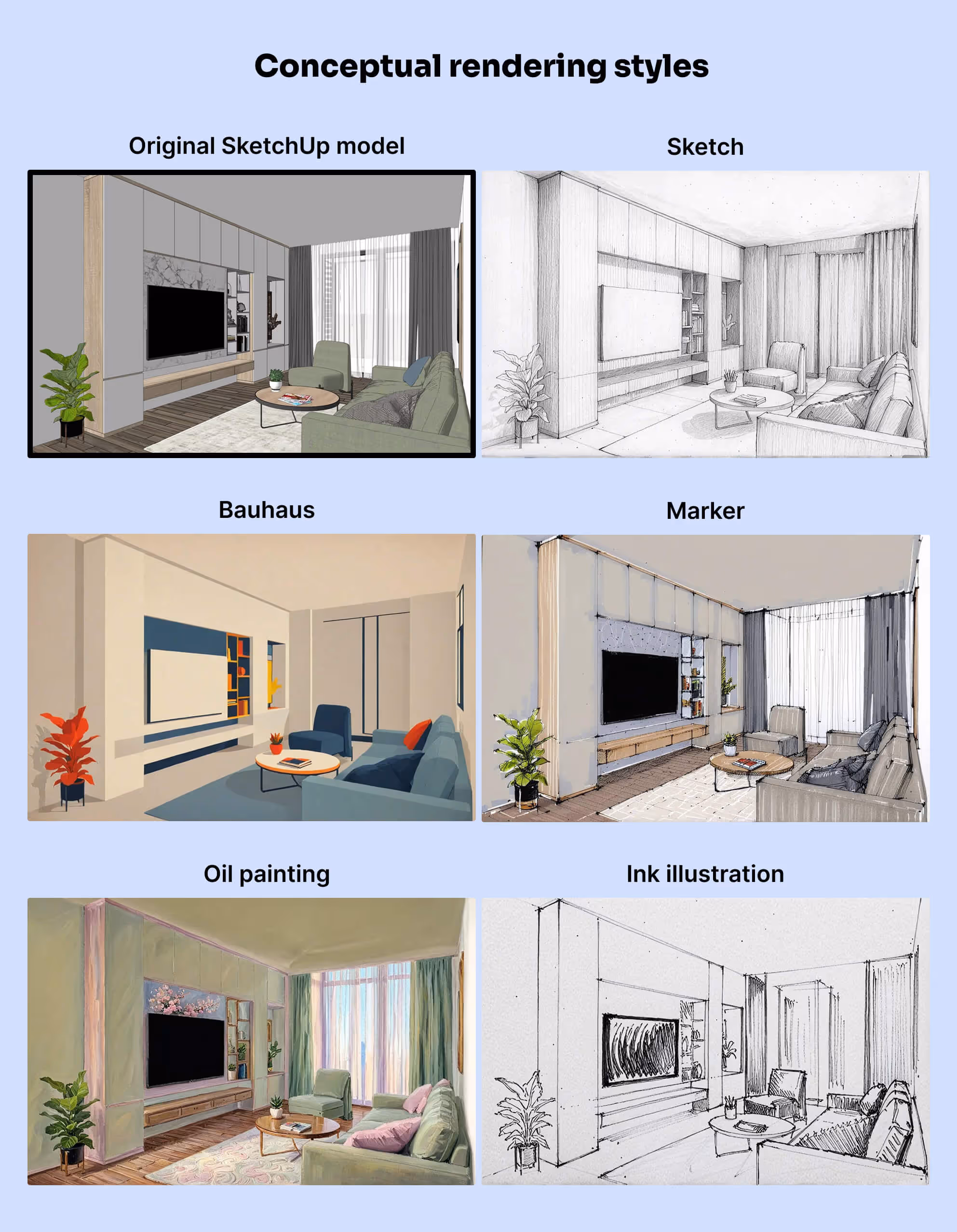 You can upload an interior or exterior CAD design export, sketch, or even a render you'd like to improve.