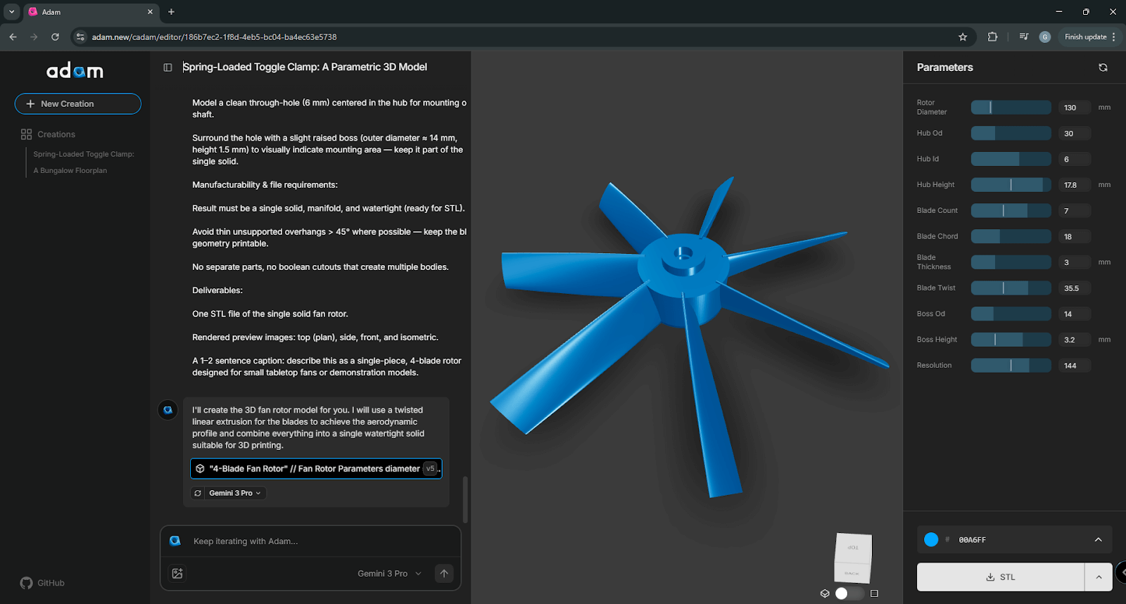 Adam AI started as a thesis project exploring AI for CAD modeling before evolving into a full startup. Its 1.0 version officially launched on January 24, 2025, and raised $4.1M in seed funding a couple of months later. With the money they received, the vision is simple: to create something that can “speak physical objects into existence.”