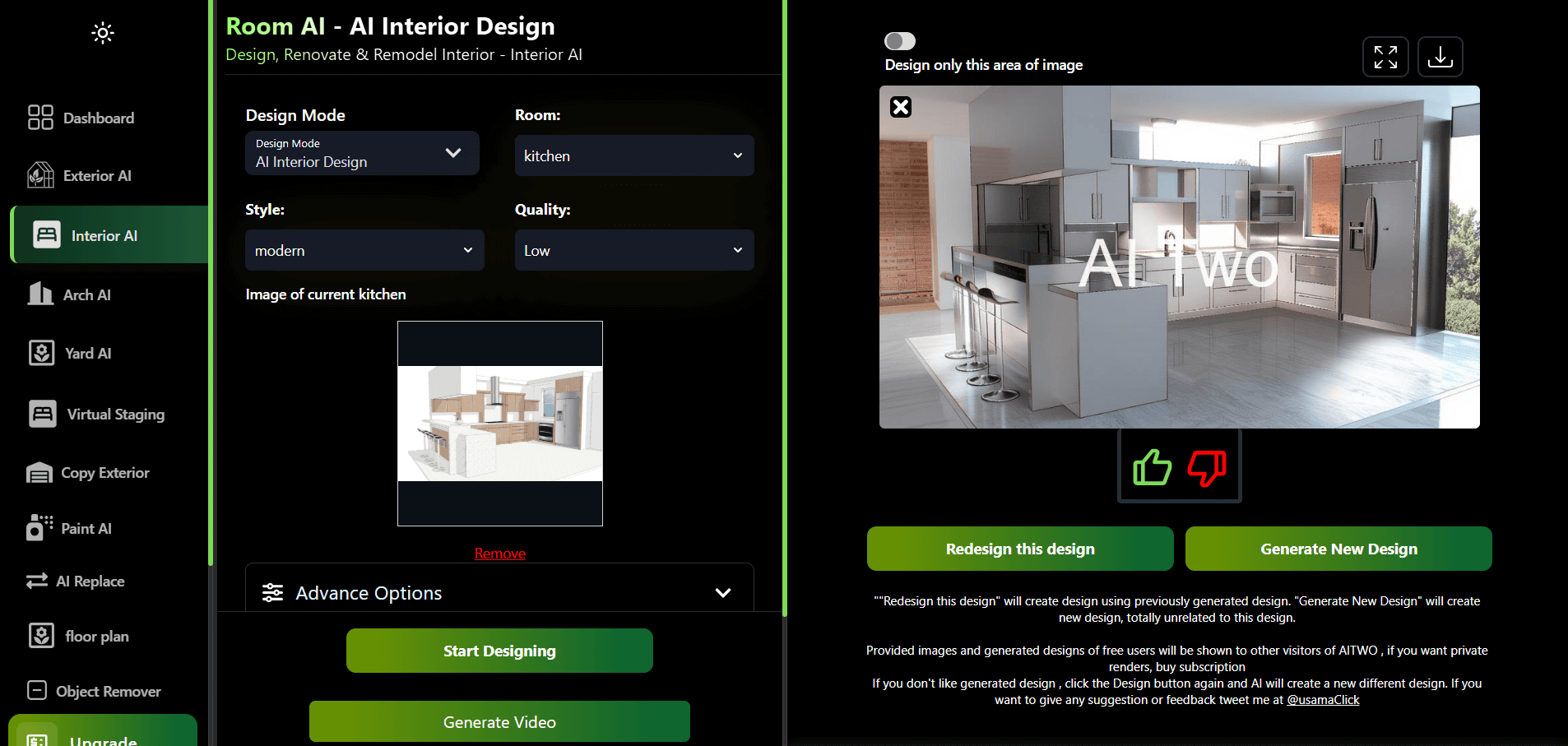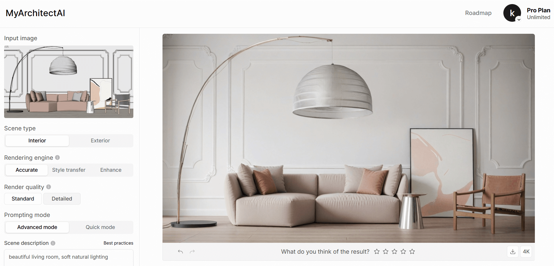 Architect Render is a simple AI tool that lets you render your interior designs using 3 settings: