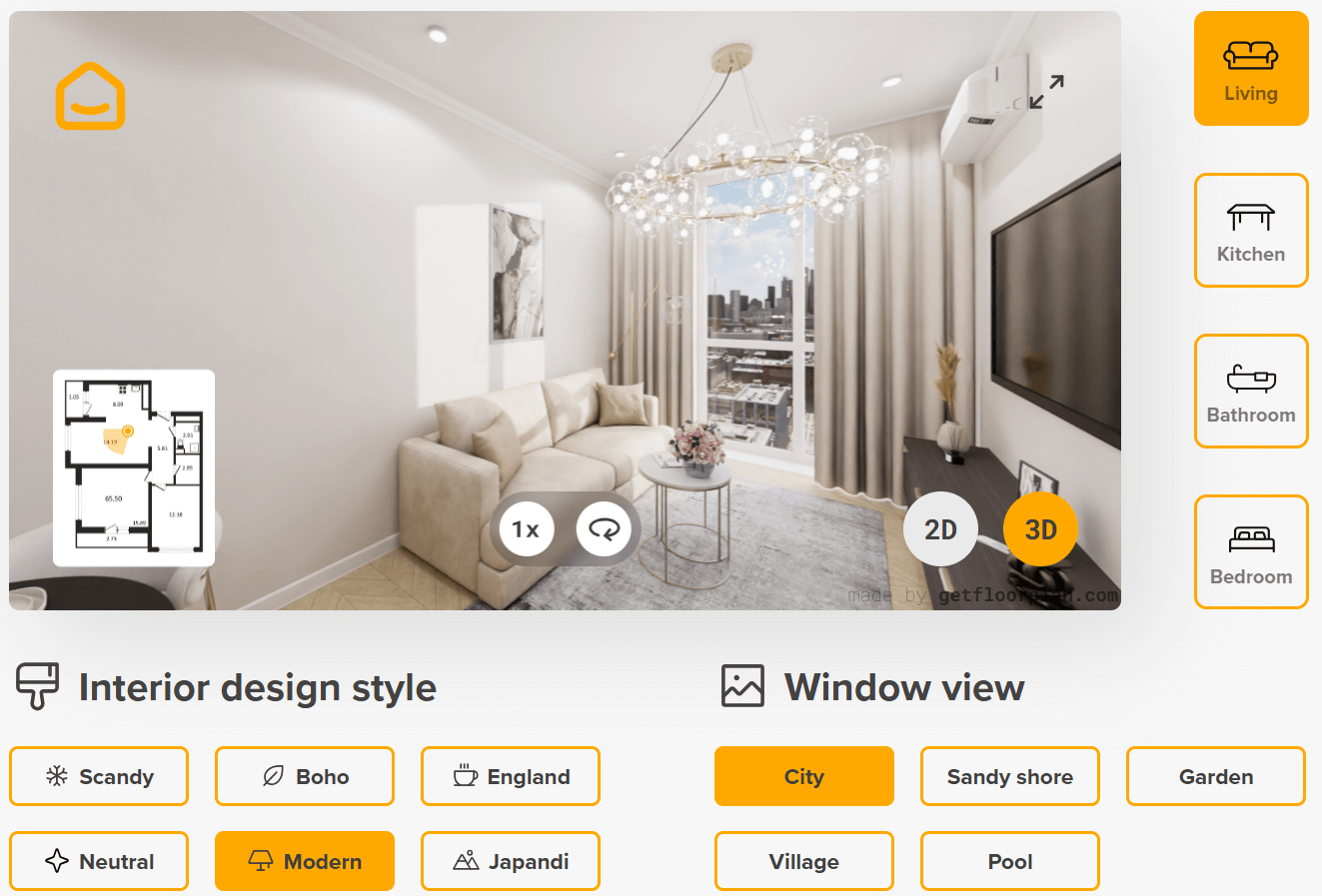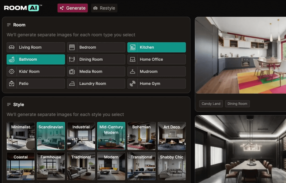 It comes with a wide range of presets for styles, color palettes, materials, and textures, which its AI engine uses to generate unique interior design ideas.