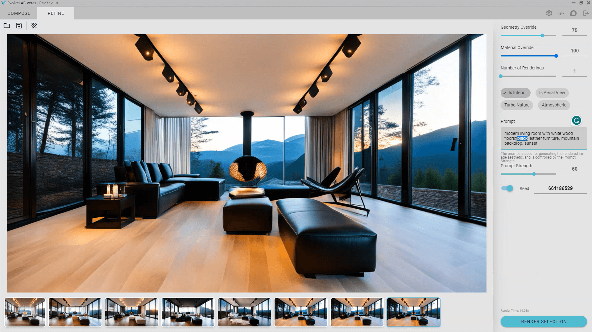 It has a wide range of customization options, such as geometry and material override, custom prompts, and prompt strength, and it can be used to render both interior and exterior scenes.