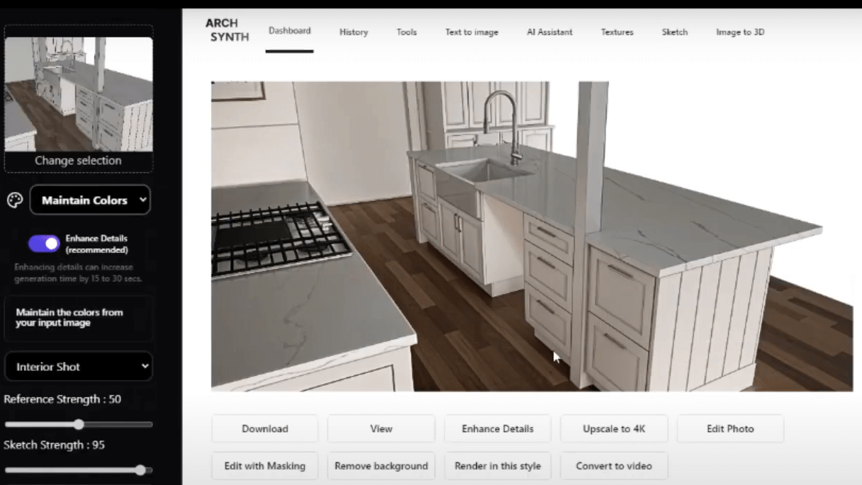 Archsynth is an easy-to-use AI renderer used by interior designers, architects, realtors, and 3D artists that generates decently realistic renderings in 10-20 seconds.