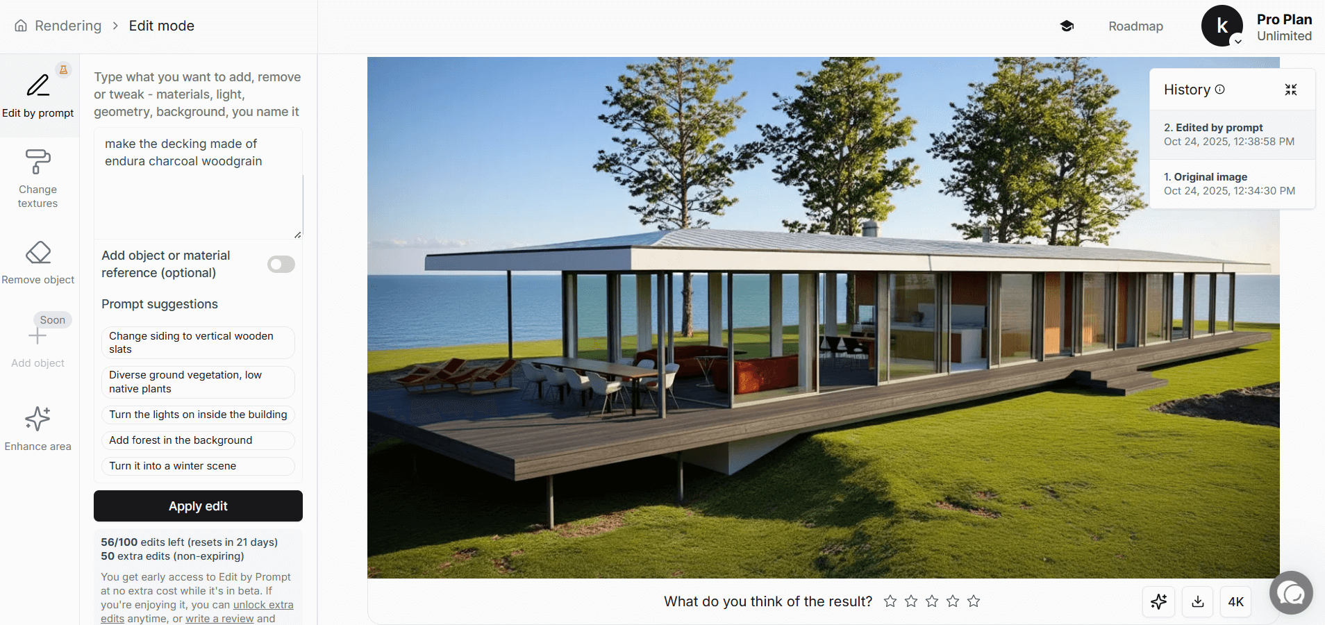 Client wants marble instead of wood? Different furniture? Click Edit and describe the change, e.g., "make the decking made of endura charcoal woodgrain."