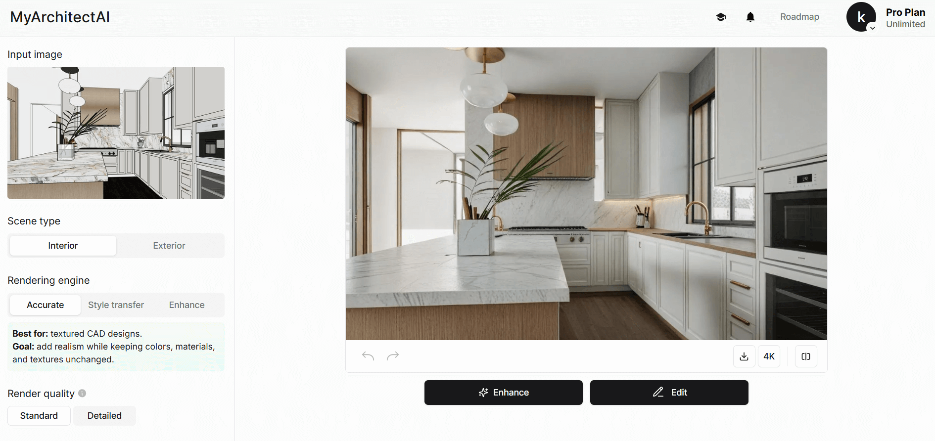 While it doesn't preserve the geometry and textures as precisely as MyArchitectAI, it can still be useful for accelerating your ideation process and creating realistic visuals of architectural and interior designs.