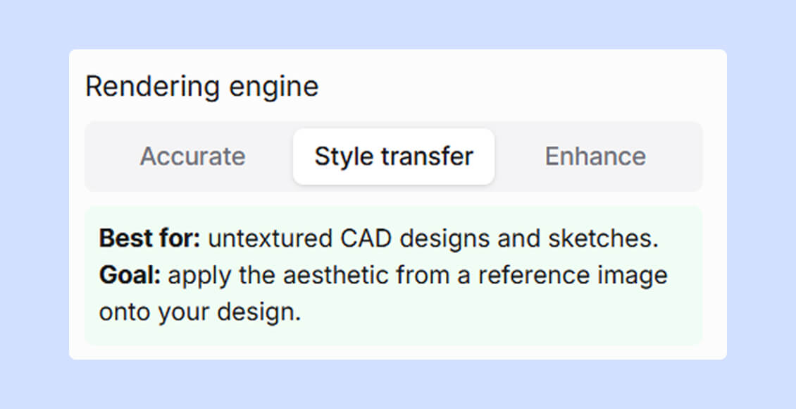 4. Pick the style transfer engine. The two other ones are made for visualizing CAD designs (accurate engine) and improving existing renders (enhance engine).