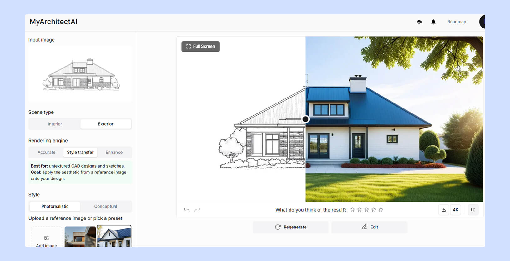 MyArchitectAI is one of the easiest rendering tools on the market, thanks to its AI-powered rendering engine that automates all the heavy lifting for you.
